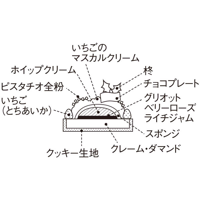 バターの風味あふれるサクサクの香ばしいアーモンドのタルトに、ローズ香るグリオットベリージャムを忍ばせて。マスカルポーネを使用したいちごクリームを絞り、「とちあいか」を愛らしく飾りました。