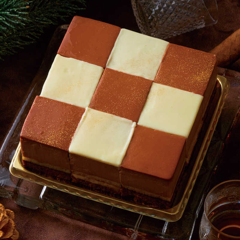 ワールドベスト・シングルモルトウイスキー2025年を受賞した「グレンアラヒー12年」を使用しました。コーヒーマティーニをイメージしたチョコレートケーキと組み合わせてチェス盤デザインに落とし込んだ大人のケーキです。