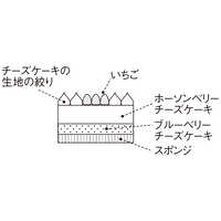 ブルーベリーのチーズケーキ、ホーソンベリーのチーズケーキ、シャルトシューズの香りの白いチーズケーキを重ねました。飾りのバラはなめらかなチーズケーキの生地を絞ったもので、いちごを可愛くトッピング。