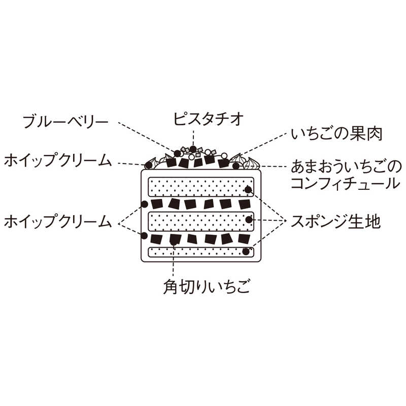 福岡県の契約農家で栽培されたいちご「あまおう」を丸ごと煮詰めた特製コンフィチュールをたっぷり使用。しっとり焼きあげたケーキ生地に、練乳を合わせたクリームや角切りいちごをサンドしました。家族や友達と祝うクリスマスに。