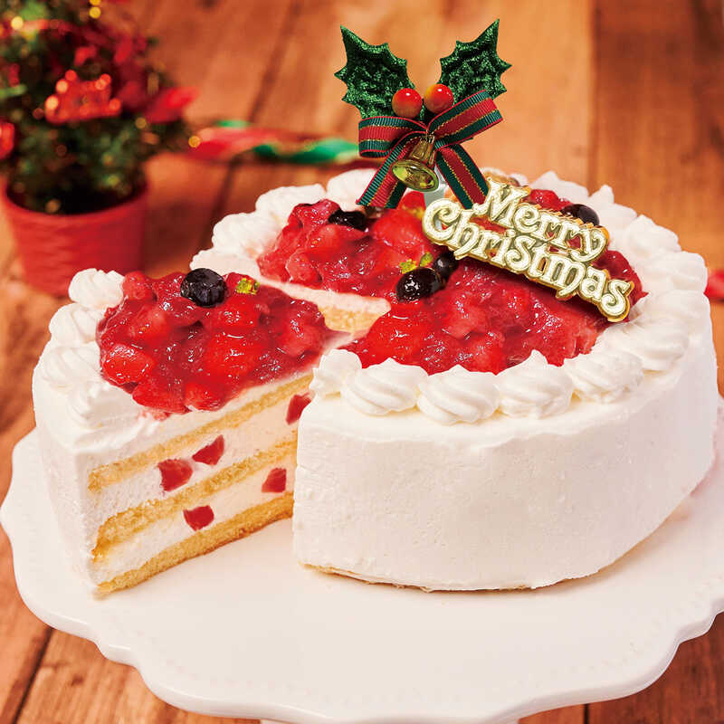 福岡県の契約農家で栽培されたいちご「あまおう」を丸ごと煮詰めた特製コンフィチュールをたっぷり使用。しっとり焼きあげたケーキ生地に、練乳を合わせたクリームや角切りいちごをサンドしました。家族や友達と祝うクリスマスに。