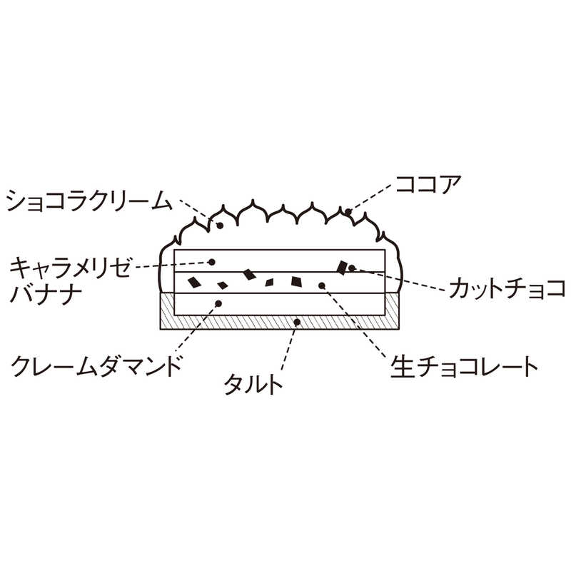 自家製ソースでキャラメリゼしたとろとろのバナナと、ほろ苦ビターな生チョコの組み合わせ。ふわふわにホイップしたショコラクリームをたっぷり絞り、ココアパウダーを贅沢にふりかけた大人のためのチョコバナナタルトです