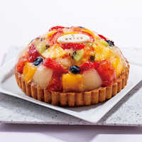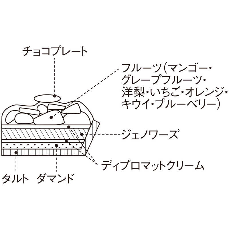 サクッと焼きあげたアーモンドプードル入りのタルト生地に、カスタード風味のクリームと、マンゴーやグレープフルーツ、洋梨、いちごなど、色とりどりのフルーツをふんだんにトッピングしました。