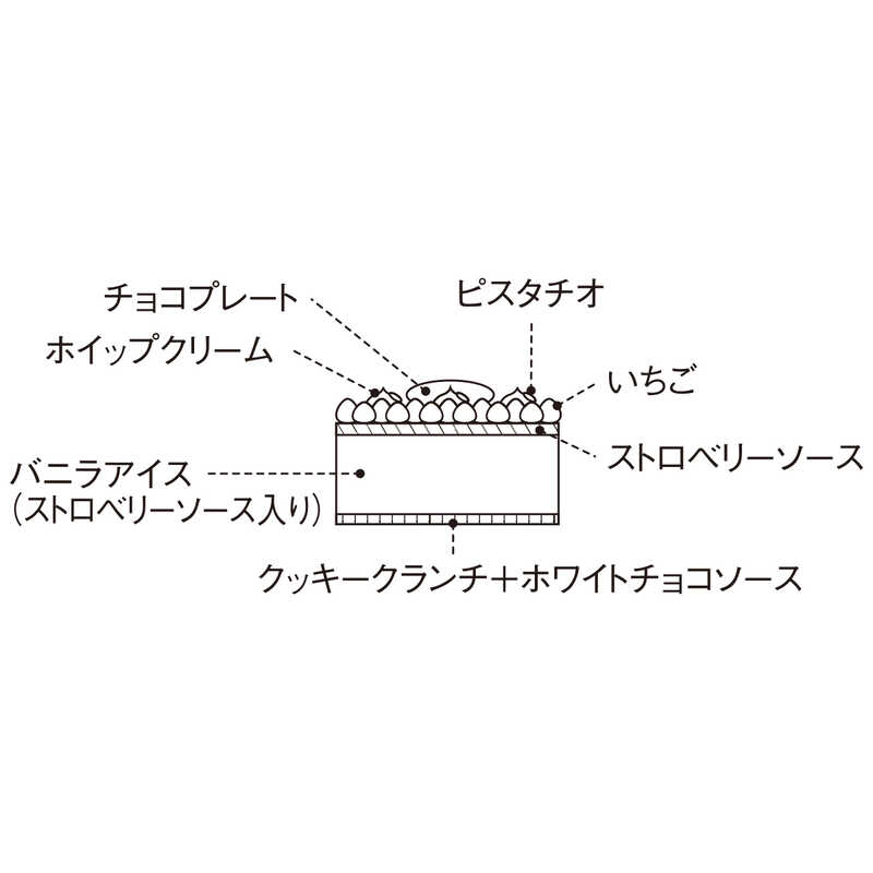 濃厚なバニラアイスに、甘酸っぱいストロベリーソースをミックス。仕上げに刻みいちごを飾り付けた、目にも華やかなアイスケーキです。底に敷きつめたクランチのサクサク食感がアクセント。