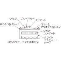 ひまわりのはちみつとマスカルポーネチーズのムースにいちごのコンポートと、はちみつ入りのスポンジを重ねて。純白のムース上には、果実とはちみつのジュレをあしらい雪景色を表現。はちみつのやさしく澄んだ甘みが口に広がります。