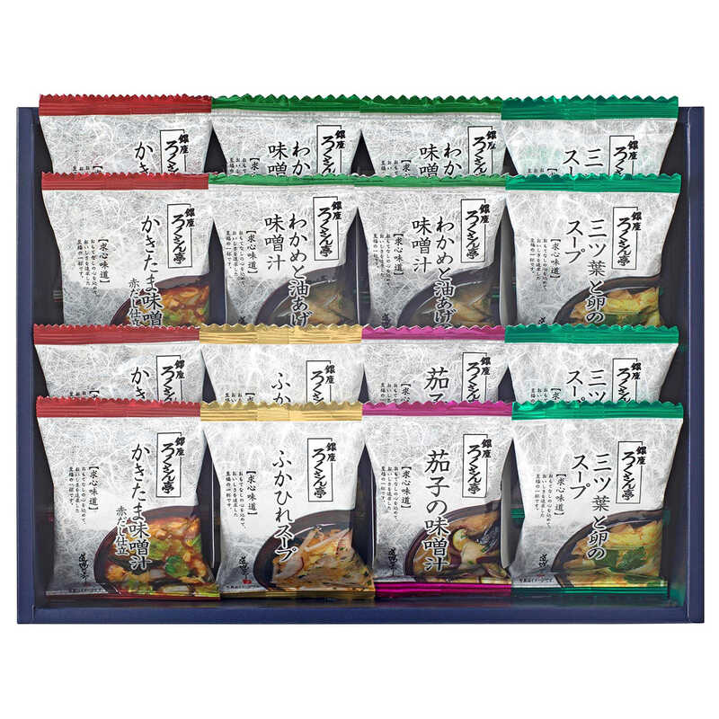 - ふかひれスープ・茄子の味噌汁×各2、わかめと油あげの味噌汁・かきたま味噌汁赤だし仕立・三ッ葉と卵のスープ×各4