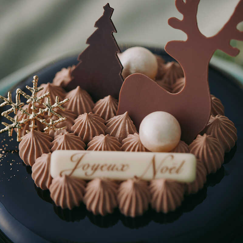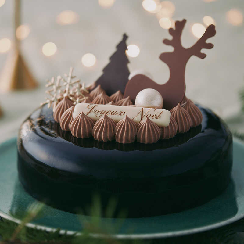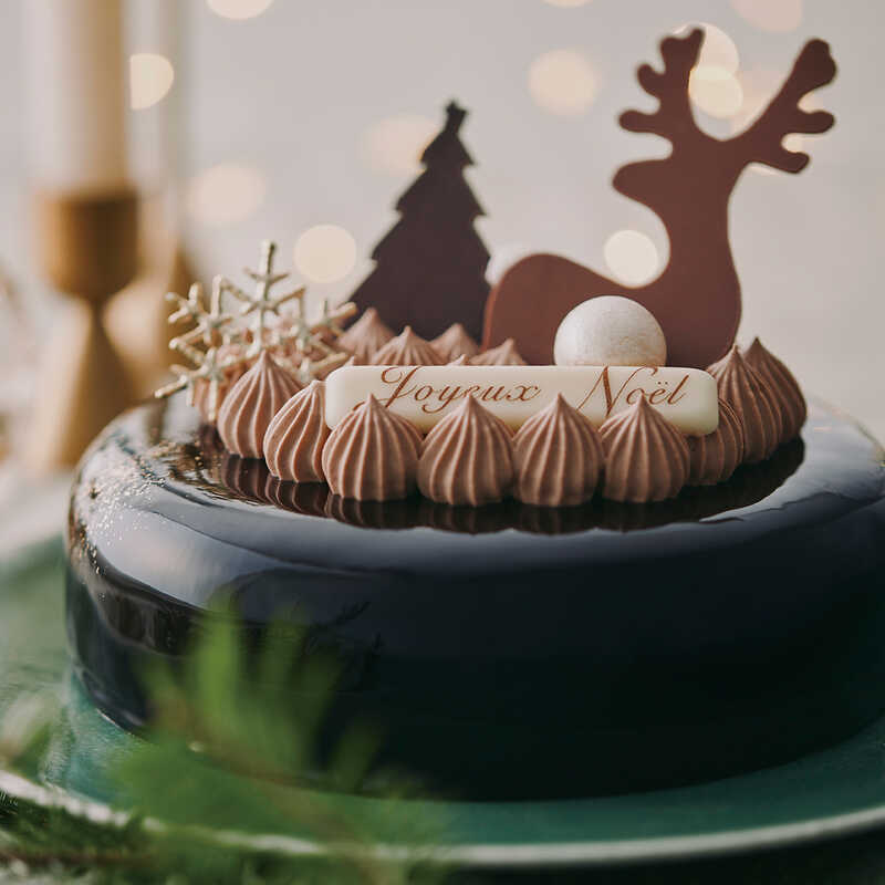 シックで艶やかなシルエットにこころが踊るショコラ・ドゥ・ノエル。ミルキーなホワイトチョコレート、ミルクチョコレート、ダークチョコレートを使い分け、3層からなる表情豊かなチョコレートケーキに仕上げました。ケーキ全体を包む美しいコーティングとキラキラと輝く金粉のアクセントが、華やかでリッチな大人のひとときを演出します。
