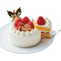 たまごの風味が豊かなスポンジケーキの間には、スライスイチゴとたっぷりのクリームシャンティをサンドしました。天面にはイチゴをトッピングし、柊オーナメントと金色の「メリークリスマス」オーナメントを飾り付けしました。