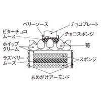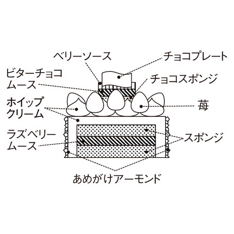 歴史あるフルーツ専門店<新宿高野>。ラズベリームースをサンドし、ホイップクリームで仕立てたケーキに、ビターチョコムースをのせ苺をトッピングしました。