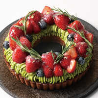 リースをかたどった、クリスマス限定のホールタルト。こだわりのタルト生地にピスタチオのクリームを重ね、色鮮やかなベリーをトッピングしました。ココア風味のタルト生地に、ホワイトチョコとドライフランボワーズを練り込んだアーモンドダマンドを重ね、香ばしく焼き上げました。仕上げに、ピスタチオクリームとイチゴ、ブルーベリーを彩り豊かに飾りつけ、華やかで心弾むひと品に。見た目の美しさはもちろん、素材の重なりが生む奥行きのある味わいと食感もお楽しみいただけます。