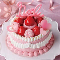 ピンクの苺クリームとハートのチョコレート、たっぷりフリルの白いクリームが彩るラブリーケーキ。