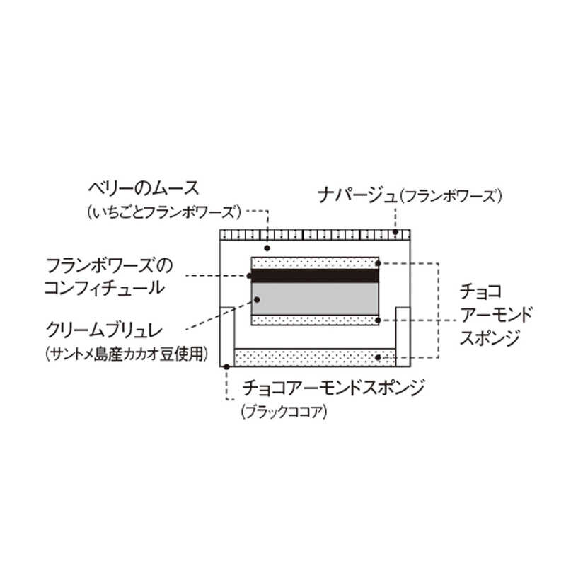 甘酸っぱいベリーのムースでフランボワーズのコンフィチュールとショコラのクリームブリュレを包みました。苺とフランボワーズのやさしい酸味が濃厚なチョコレートの甘さを引き立てる、華やかな味わいです。