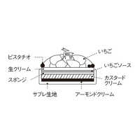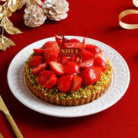 いちごが主役のクリスマスタルト。シンプルな組み合わせでいちごを楽しめるタルトです。いちごソースはいちごのおいしさをより引き立たせています。見た目はシンプルさの中に華やかさがあり、いちごの赤とピスタチオの緑でクリスマス感アップ。