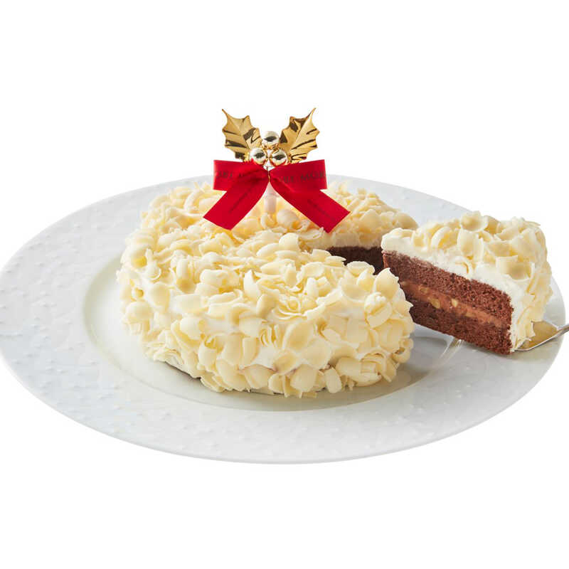 ホワイトチョコレートで包み込んだやわらかいフォルムのチョコレートケーキ。ウォールナッツ(くるみ)入りのチョコレートクリームをふわふわのチョコレートスポンジでサンドしました。ホワイトチョコレートで雪をイメージしたクリスマスを彩るケーキです。