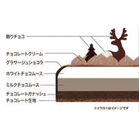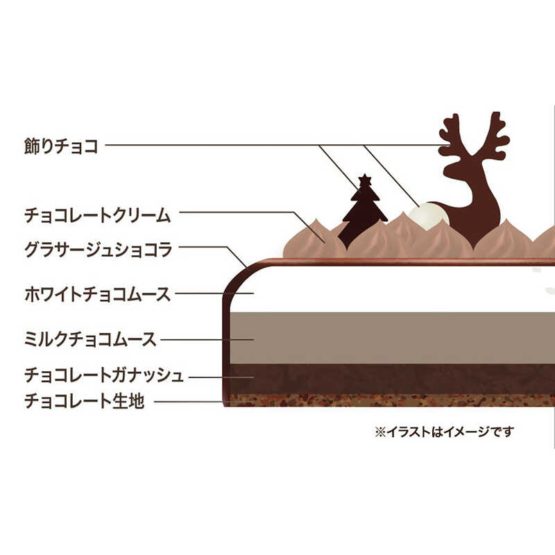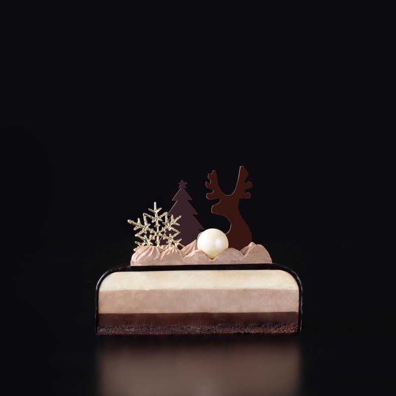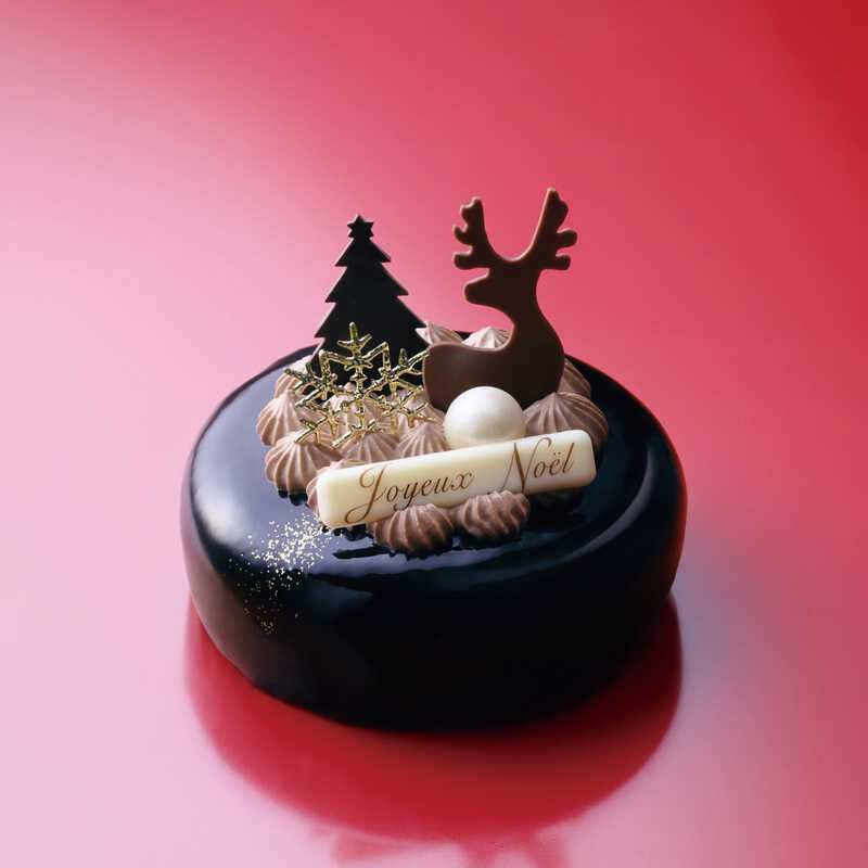 シックで艶やかなシルエットにこころが踊るショコラ・ドゥ・ノエル。ミルキーなホワイトチョコレート、ミルクチョコレート、ダークチョコレートを使い分け、3層からなる表情豊かなチョコレートケーキに仕上げました。ケーキ全体を包む美しいコーティングとキラキラと輝く金粉のアクセントが、華やかでリッチな大人のひとときを演出します。