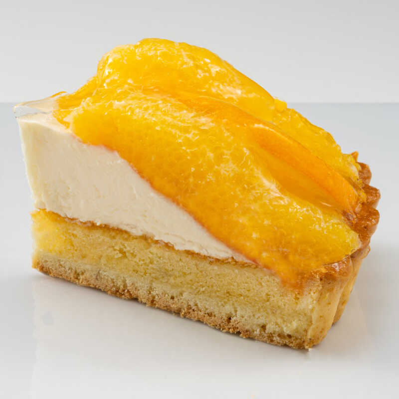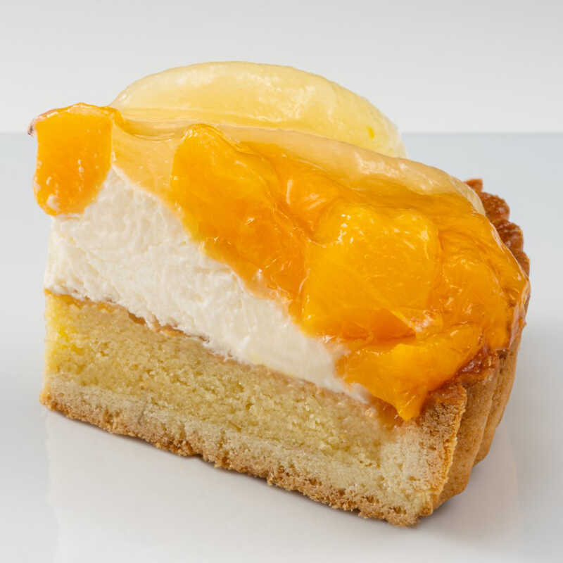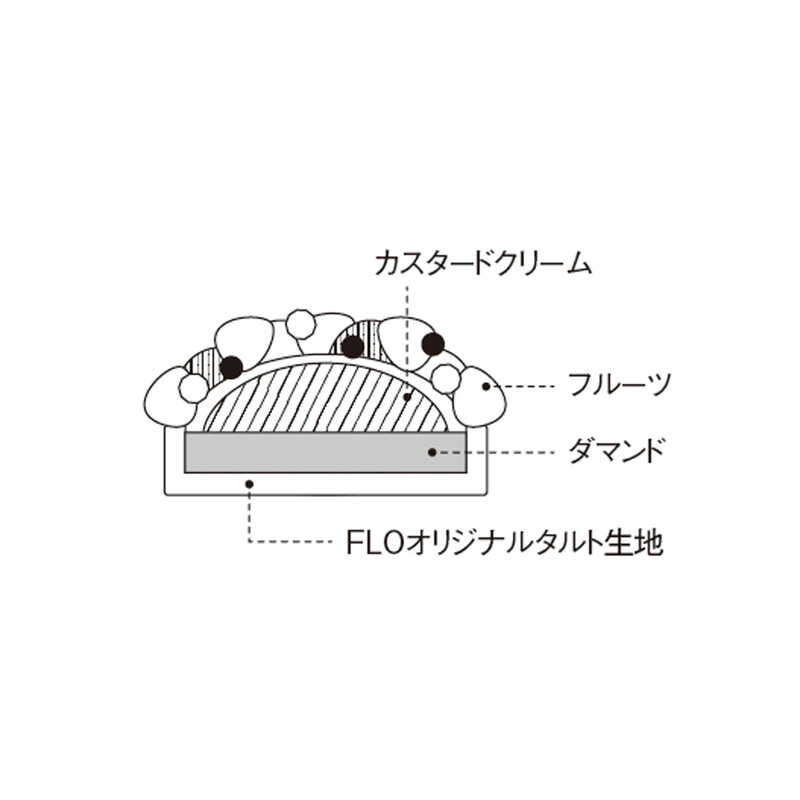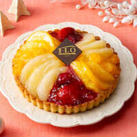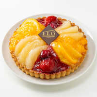 アーモンドパウダーを加え香ばしく焼き上げたサクサク食感のタルト生地の上に、カスタードクリーム、色とりどりの5種のフルーツを盛り付けた煌びやかなフルーツタルト。