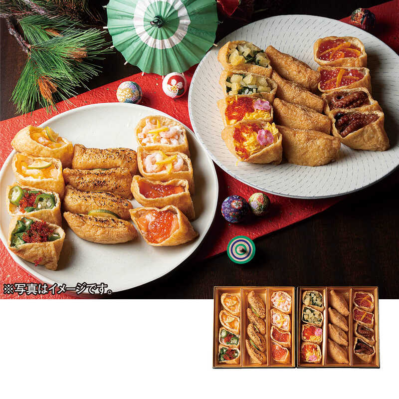 炙りいなり・プレーンいなり×各4、数の子いなり・ちらしいなり・いくらいなり・たこのいなり・サーモンいくらいなり・海老いなり・オクラいなり・黄金いかいなり×各2
