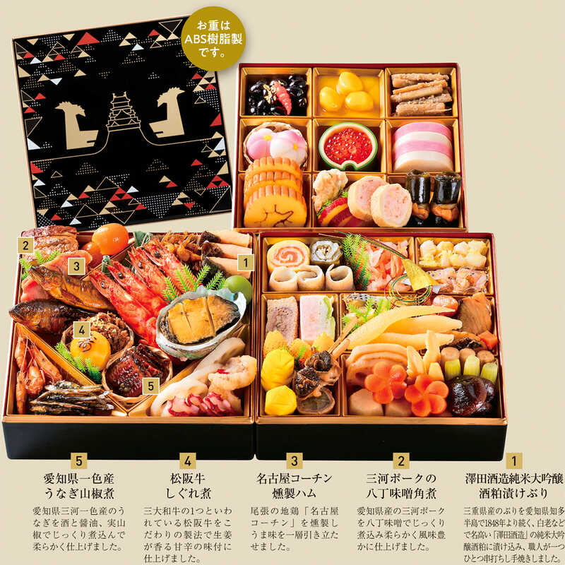 松阪牛・名古屋コーチン・三河一色産うなぎなど、東海を代表する品々を詰め込み、お重の蓋には地元のシンボル「金シャチ」をデザインしました。新年のはじまりに、地元の良さを再認識していただけるような、そんな想いで仕上げた、その名も「金シャチおせち」です。