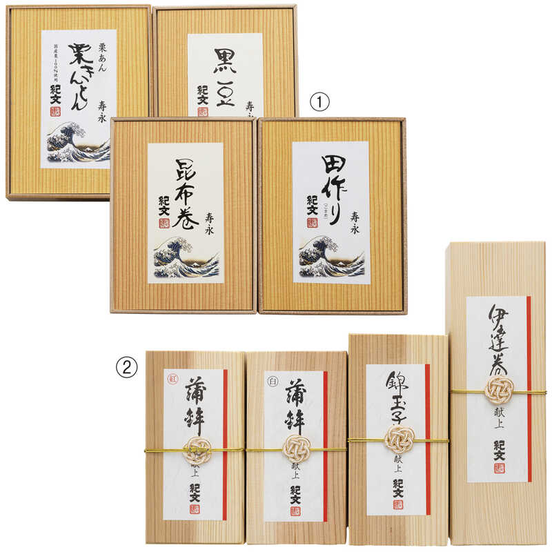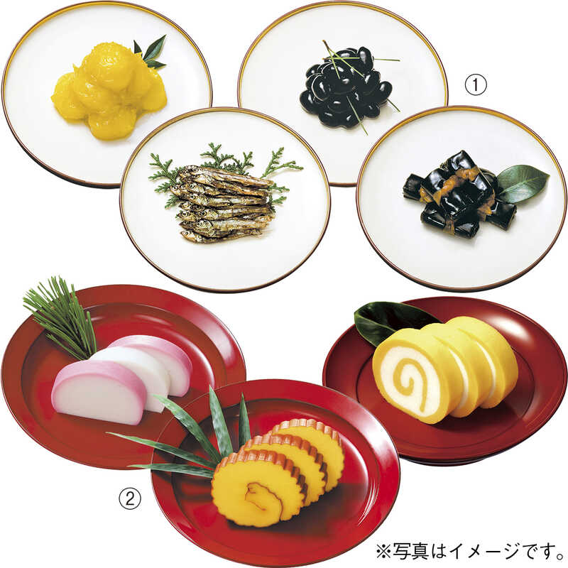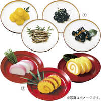 蒲鉾(紅・白)、伊達巻、錦玉子×各1本、栗きんとん、黒豆、田作り、昆布巻×各1箱