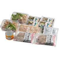 生・月山そば(山菜そば専用)2食入×2パック、生キノコ3種・三つ葉1束×2パック、山菜水煮4袋、なめこ缶詰1缶、国産 蒸し鶏100g×2袋、山菜そば専用タレ4袋