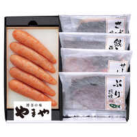 辛子明太子150g(3~7本、密封袋入)、サーモントラウト塩焼・銀ひらすの西京焼き・ぶり照焼・さば塩焼×各1