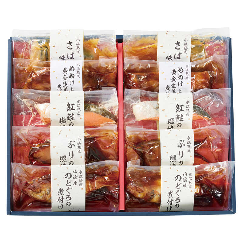 - ぶりの照り焼き・さばの味噌煮(各90g)・紅鮭の塩焼き(60g)・めぬけと黄金生姜の煮付(100g)・のどぐろの煮付(85g)×各2
