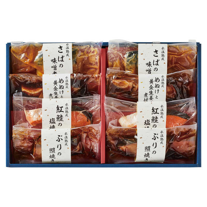 - ぶりの照り焼き・さばの味噌煮(各90g)・紅鮭の塩焼き(60g)・めぬけと黄金生姜の煮付(100g)×各2
