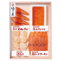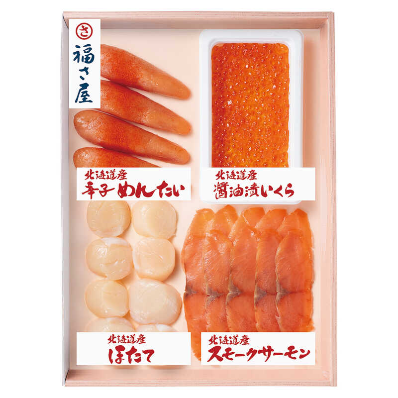 - 北海道産/辛子めんたい150g(3~5本、密封袋入)・いくら醤油漬け(60g)・ほたて貝柱(150g)×各1、スモークサーモン(50g)×2