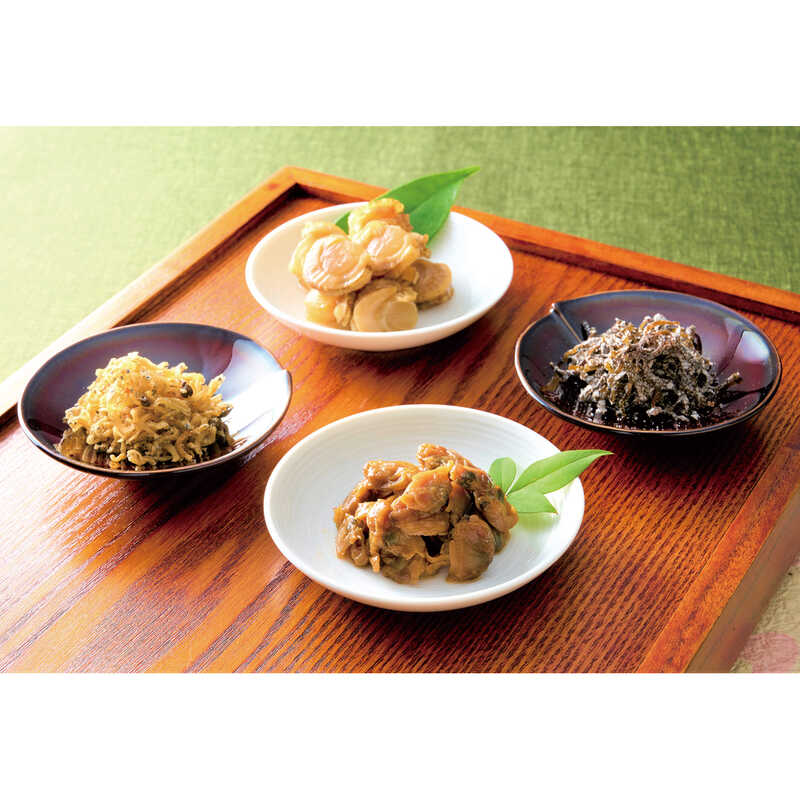 あさりふかし煮・さざめ昆布(各50g)・ほたて黄金煮・牛肉そぼろ(各40g)・鰹でんぶ(30g)×各1