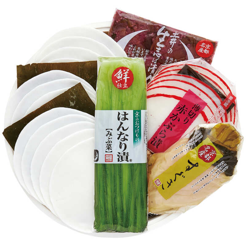 千枚漬(250g)・すぐき(221g)・薄切り赤かぶら漬(80g)・はんなり漬みぶ菜(90g)・生志ば漬(73g)×各1