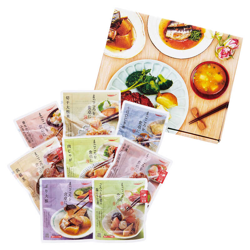 - 洋風牛すじ煮込み(100g)・肉じゃが(170g)・ぶり大根(130g)・筑前煮・ごろっと野菜の塩こうじ煮(各120g)・穂先たけのことふきの土佐煮(80g)・十目ひじき煮(70g)・切干大根煮(85g)×各1