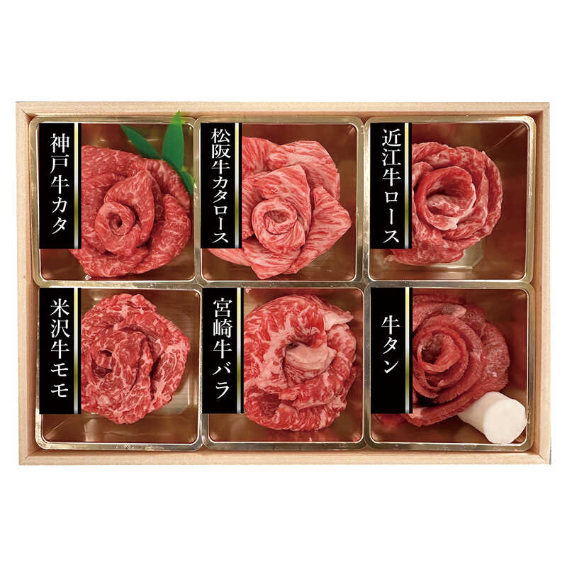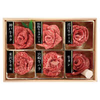 - 神戸牛肩・松阪牛肩ロース・近江牛ロース・米沢牛モモ・宮崎牛バラ・牛タン(各60g)