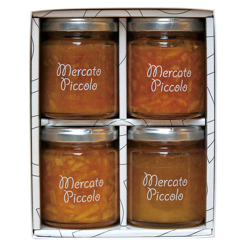 全ての原料が国産です。メルカートピッコロは、いちごジャムよりも、柑橘系の方がよく売れるジャム屋さんです。その中でも一番人気のブラッドオレンジ、上品で苦みが少ないバレンシアオレンジ、ほろ苦さが美味しい河内晩柑に、濃いオレンジ色が特徴の小原紅みかんを皮ごと使った濃厚なジャムの4種類の詰合せです。