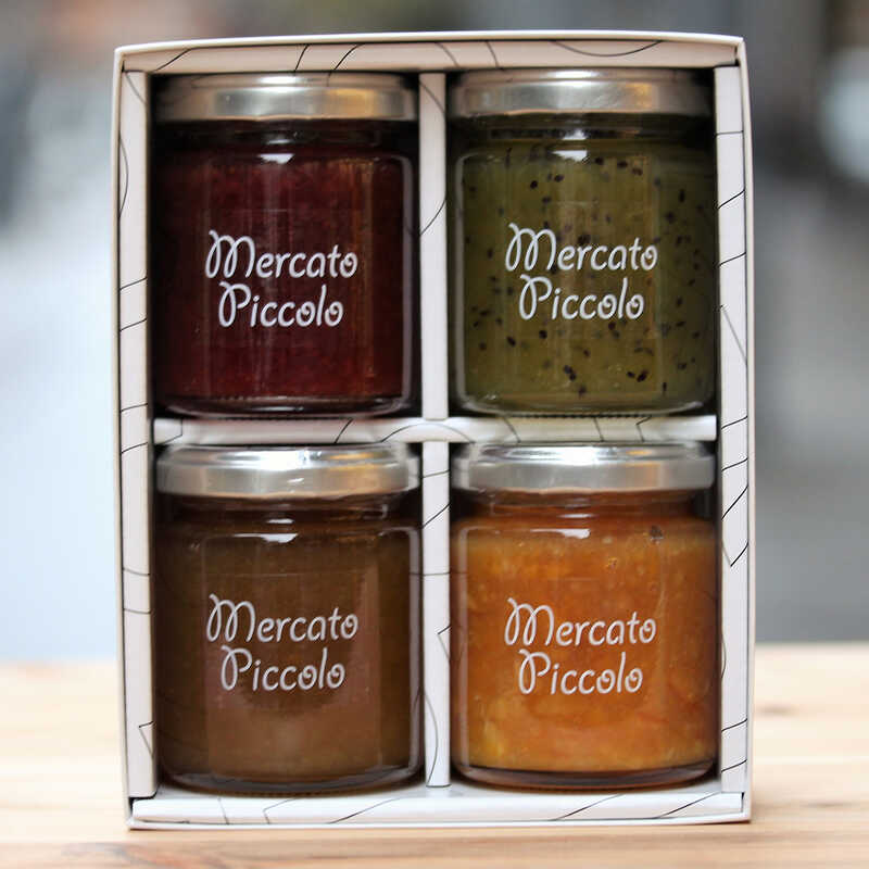 全ての原料が国産です。メルカートピッコロがおすすめするジャムを詰め合わせました。一番人気のブラッドオレンジマーマレード。果汁感たっぷりのジャムキッチンいちごジャム、甘酸っぱい仕上がりのジャムキッチンキウイジャム、まるでデザートのような上品でまろやかな皮ごとりんごジャム。