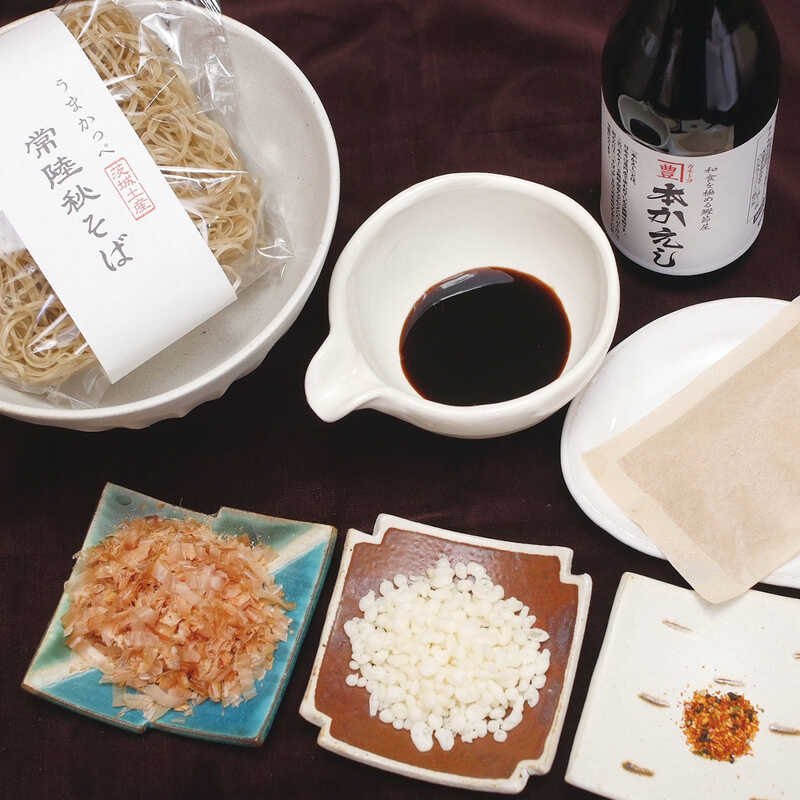 おいしい出汁を知り尽くしたかつお節専門店が自信を持ってお届けする高級即席麺セット。そばは、そば職人から評判が高いブランド品種「常陸秋そば」。その豊かな風味を生かすため、低温回転の石臼挽きで丹念に仕上げたそば粉を、ノンフライの低温乾燥麺に仕上げています。また、本かえしは、地元の老舗〈ヨネビシ醤油〉の醤油を使って、そば専門店と同様の製法で仕上げた本格派の味わいです。味の決め手となる出汁は、〈河津商店〉特製のだしパックを煮出すだけで簡単に作れます。