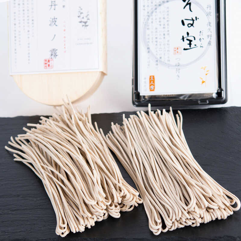 京都 福知山・夜久野は昼夜の寒暖差が大きく霧が多く発生し良質なそばが育ちます。50年ほど前からそばの産地として有名でしたが、時代の流れと共に生産が減ってしまいました。「夜久野のそば」の復活をかけて近隣の農家と協力し、自社生産したそばの実の外皮を取り除いて挽いたそば粉『丸抜き粉』を使った香り高い白地の麺「丹波ノ霧」とそばの実を外皮ごと挽いたそば粉『挽ぐるみ粉』を使った力強い味と香りの田舎蕎麦「そば宝」を詰め合わせた2種類の蕎麦食べ比べセットです。