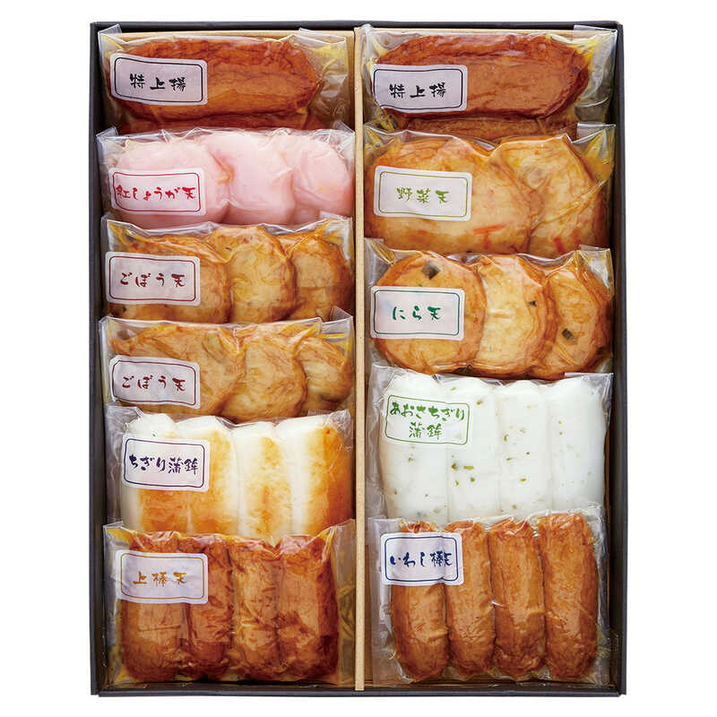 - にら天・紅しょうが天(各15g)×各3、ごぼう天(15g)×6、特上揚(30g)×各4、野菜天(35g)×2、あおさちぎり蒲鉾・ちぎり蒲鉾(各15g)・上棒天・いわし棒天(各12g)×各4