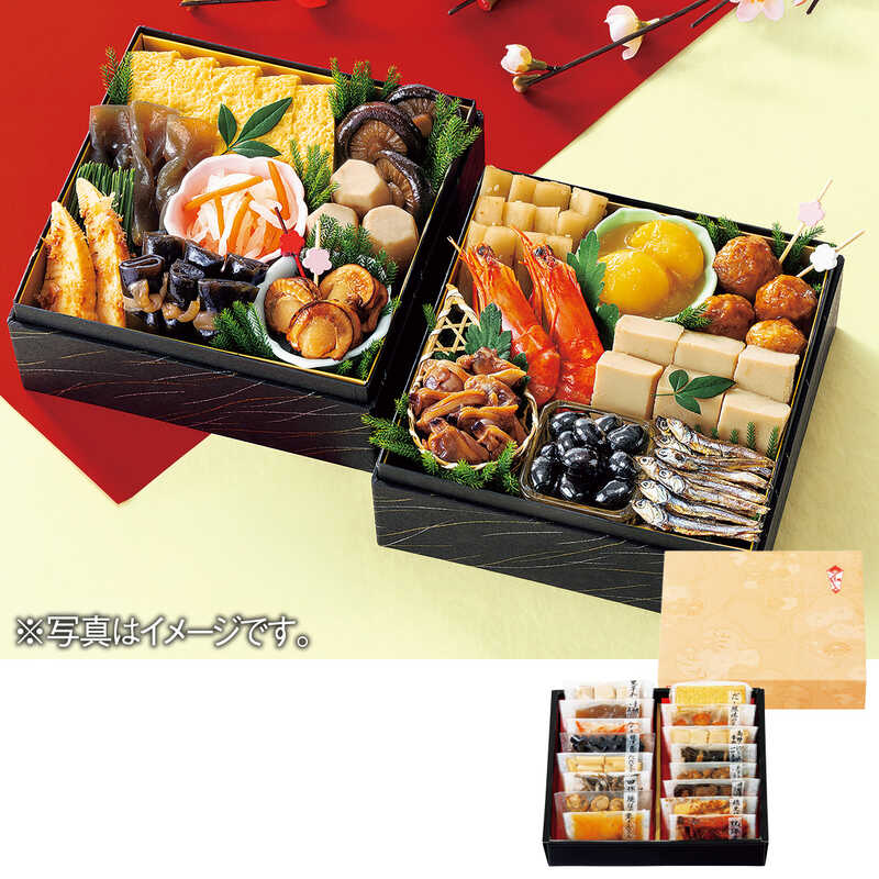 あさりのうま煮(60g)、照焼つくね(60g)、田作り(20g)、丹波黒黒豆(60g)、里芋含め煮(3個)、たたきごぼう(70g)、にしん一口巻昆布(6本)、栗きんとん(70g)、味付しいたけ(3枚)、穂先竹の子(2切)、なます(50g)、焼ほたて(3個)、だし巻(150g)、手綱こんにゃく(3切)、高野豆腐含め煮(6切)、祝海老(2尾)