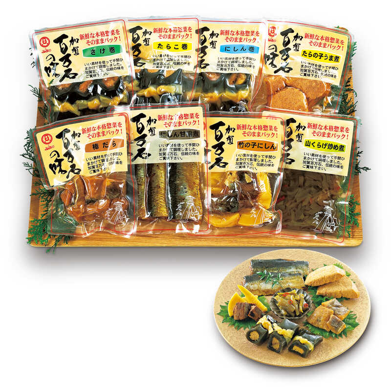 - 棒だらうま煮(100g)・さけ巻切・たらこ巻切・にしん巻切・にしん甘露煮(各3本)・山くらげ炒め煮(150g)・たらの子うま煮・竹の子にしん(各110g)×各1