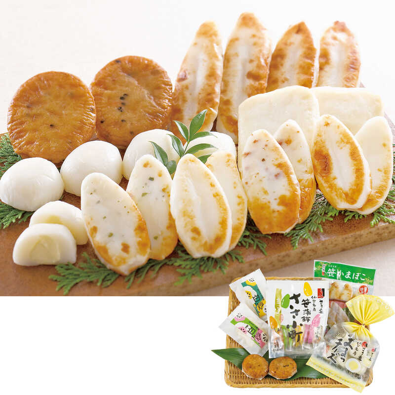- 揚げ蒲鉾「遊里揚」(五目)×2、おとうふ蒲鉾「白妙」/プレーン・柚子×各1、まるっチーズ(5個入)・ささ小町ミックス(4種各2枚入)・厚焼笹かま(4枚入)×各1