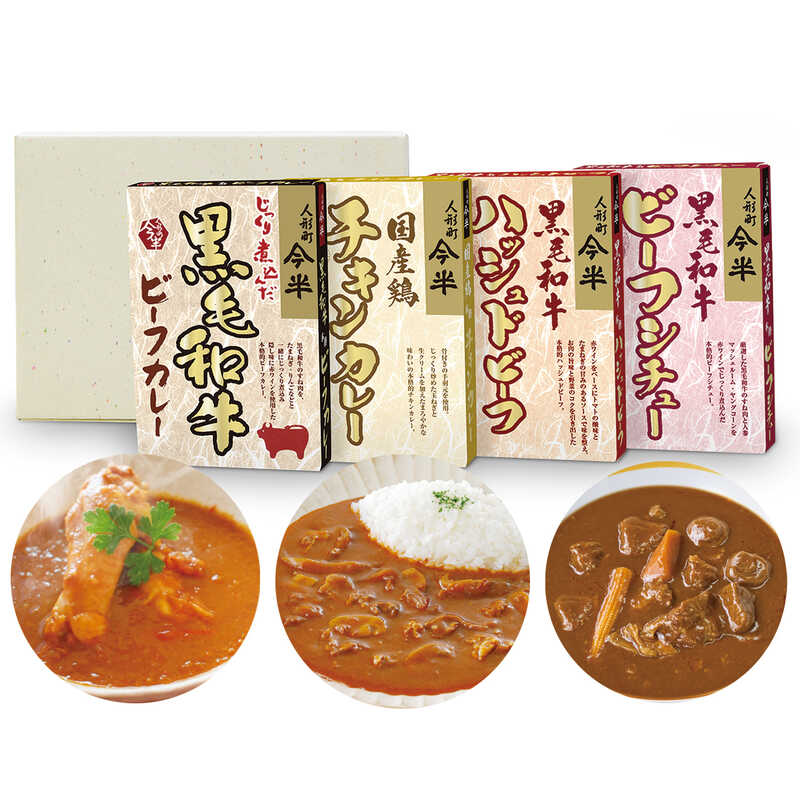 - 黒毛和牛ビーフカレー・黒毛和牛ビーフシチュー・黒毛和牛ハッシュドビーフ・国産鶏チキンカレー(各200g)×各1