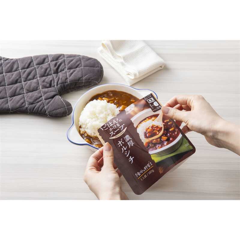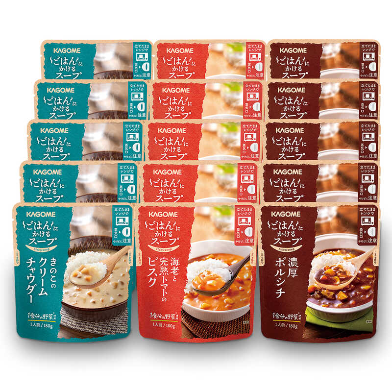 - ごはんにかけるスープ/海老と完熟トマトのビスク・濃厚ボルシチ・きのこのクリームチャウダー(各180g)×各5
