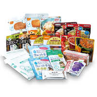 ごはん(カレー味・五目・梅じゃこ・炒飯)・おにぎり(鮭・わかめ)・パン2種・クッキー(イチゴ)・ようかん・LIFESTOCKブドウ・野菜スープ(トマト・かぼちゃ)・筑前煮×各1、歯磨きシート・防災用ウェットティッシュ×各1、簡易トイレ×4、泡なしシャンプー(2枚)×2