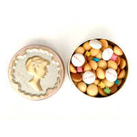 “おめでとう”の文字が入ったマーブルチョコとクッキー、金平糖の詰合せ缶です