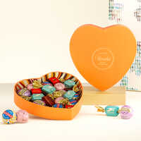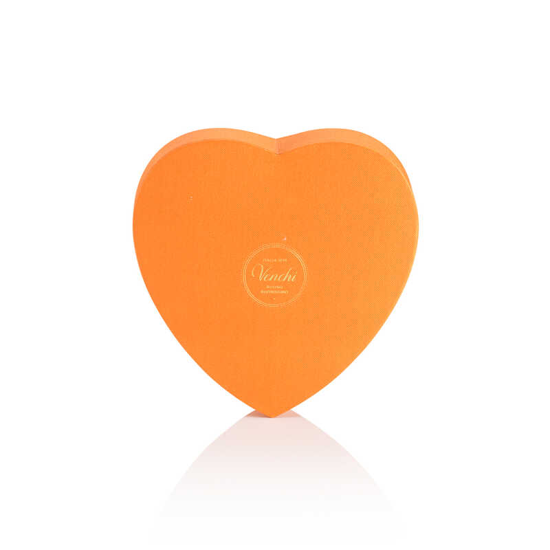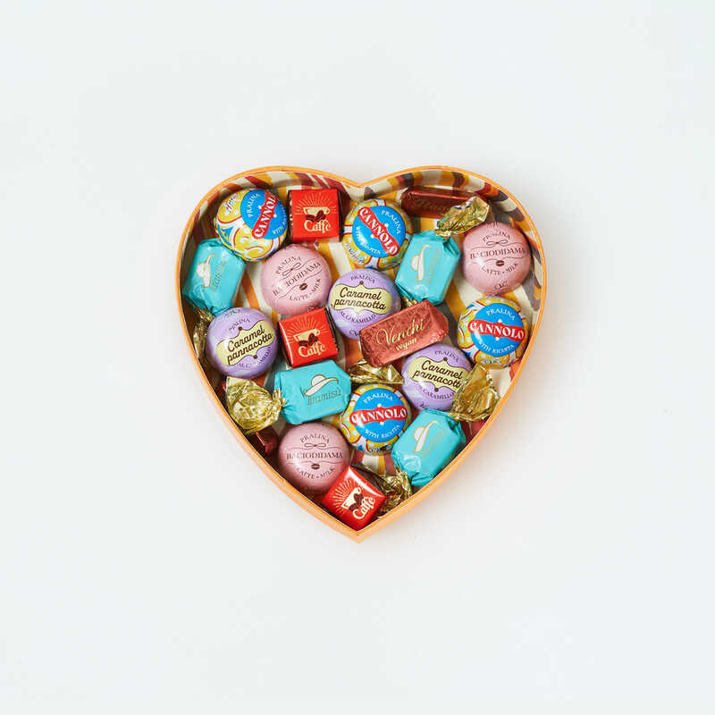 鮮やかなオレンジ色のボックスにネイビーのリボンが映えるおおらかなハート型のギフトボックス。 ティラミスやパンナコッタなど、イタリアンドルチェシリーズを中心に華やかなチョコレート6種類20個をアソートしました。