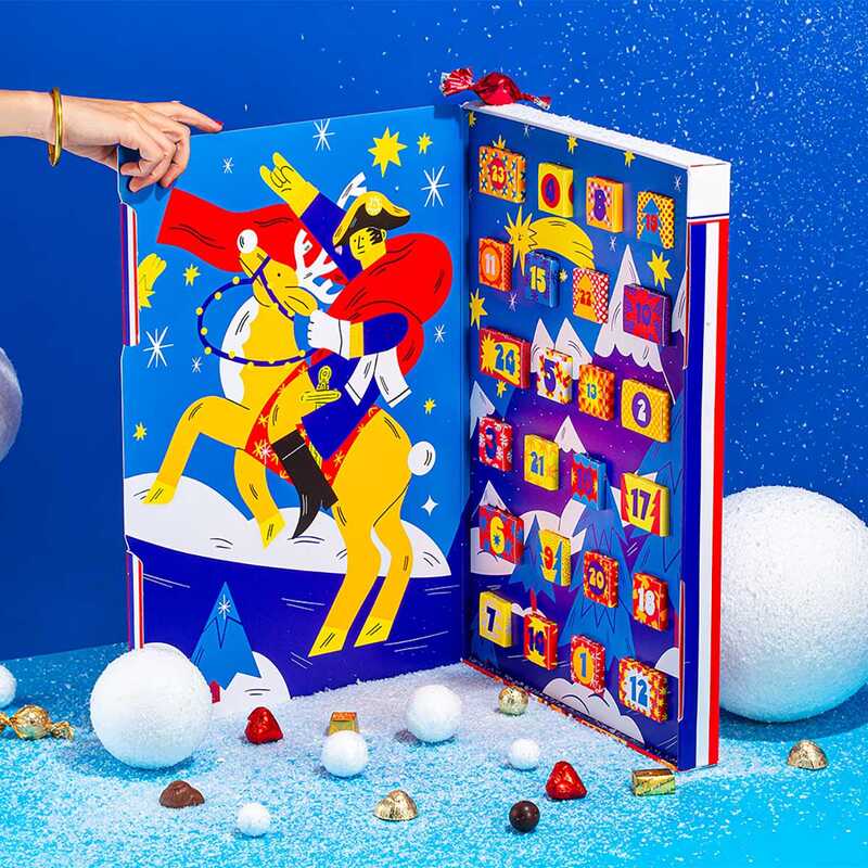 「フレンチクリスマス」をテーマに、遊び心あふれるデザインで彩られた特大カウントダウンカレンダーが登場! スケート靴を履いたエッフェル塔や、デコレーションされたノートルダム大聖堂など、フランスの名所がクリスマス仕様に大変身。デザインひとつひとつに込められたストーリーに思いを馳せたり、調べたりしながら、カウントダウンの時間を楽しめます。中には21種類のチョコレート!クッキーやキャラメル、クリスピーなど、クリスマス限定のトリュフに、ル・ショコラ・デ・フランセらしい可愛い包み紙のナポリタンチョコも!見て楽しい、食べてうれしい、フレンチ気分で楽しむカウントダウンをどうぞ!
