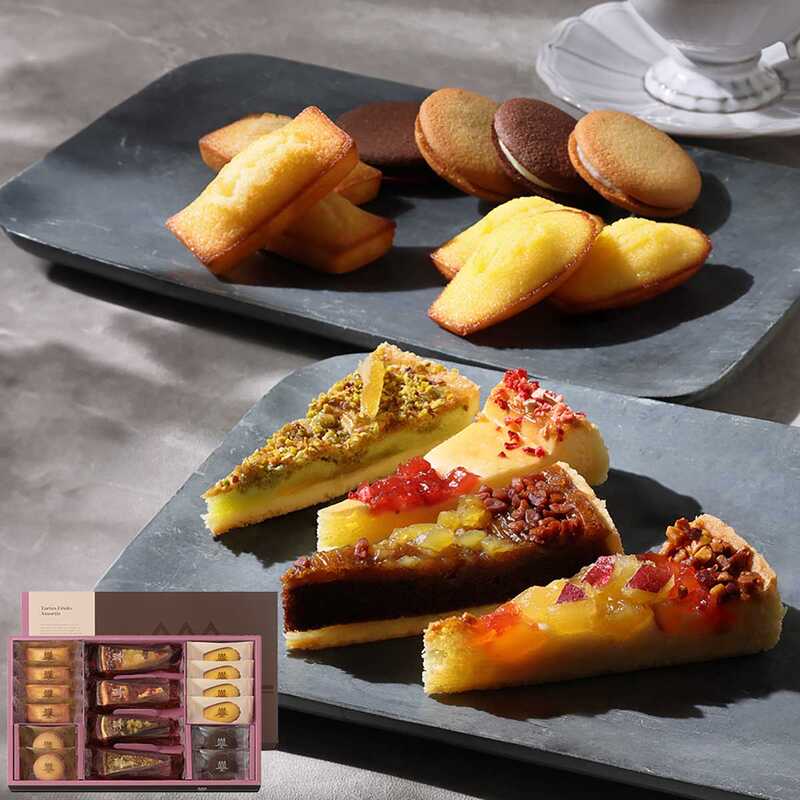 フィナンシェ 4個、マドレーヌ 4個、ラング・ド・シャ(プレーン、チョコレート)各2個、タルト・フリュイ(フロマージュ・フレーズ、ピスタチオ・シトロン、ポム・ドゥース、ショコラ・マロン)各1個