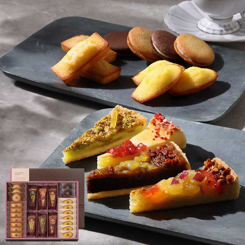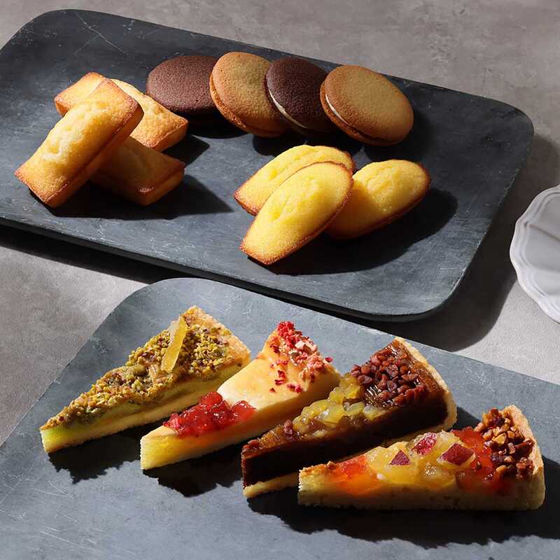 - フィナンシェ 7個、マドレーヌ 7個、ラング・ド・シャ(プレーン)3個、(チョコレート)2個、タルト・フリュイ(フロマージュ・フレーズ、ポム・ドゥース)各2個、(ピスタチオ・シトロン、ショコラ・マロン)各1個