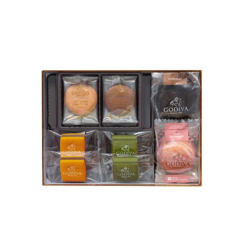 ゴディバで人気の焼き菓子「サブレショコラ」「ラングドシャクッキー」「ドームバームクーヘン」の3種を色とりどりにアソートしました。定番フレーバーと期間限定フレーバーいずれも楽しんでいただけるアソートメントです。