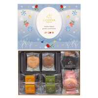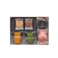 - サブレショコラ4個(ミルクチョコレートキャラメル、抹茶&ホワイトチョコレート各2個)、ドームバームクーヘン2個(あまおう苺、ショコラ各1個)、ラングドシャクッキー4枚(ミルクチョコレート、ダークチョコレート各2枚)
